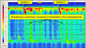 3. Manometry: Manometry involves the passage of a thin tube through the mouth or nose into the esophagus. The tube is lined by numerous pressure sensors that convey pressures within the esophagus to a device. The test measures the changes in pressures within the esophagus that are caused by the contraction of the muscles esophagus. Manometry is almost always used to confirm the diagnosis of achalasia. The test typically reveals three abnormalities in people with achalasia: high pressure in the LES at rest, failure of the LES to relax after swallowing, and an absence of useful (peristaltic) contractions in the lower esophagus.