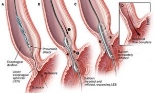 2. Balloon dilatation: This procedure is carried out under sedation. After preliminary endoscopy, a collapsed balloon is passed through the mouth and positioned in the region of the LES using guidance from an x-ray machine. It is then inflated in order to tear the muscle of the LES. The effect of a balloon dilatation in relieving the symptoms is temporary; most patients require multiple balloon dilatations at progressively shorter intervals and eventually require surgery. The most serious complication of a balloon dilatation is perforation (creation of a hole) of the esophagus, which occurs in 1% – 6% patients. The risk of a perforation increases with repeated dilatations. Because the LES has been made ineffective, 2% – 5% patients also develop gastroesophageal reflux disease (GERD) after balloon dilation. Also, after repeated dilatations the surgery, when it is eventually required, becomes more chalenging. For these reasons, this treatment is best reserved for patients who are unfit for surgery due to old age or medical conditions which make administration of general anesthetic risky. Young and fit patients not wishing to undergo surgery upon diagnosis of achalasia may be offered one dilatation, but are best councelled regarding surgery when the symptoms recur.
