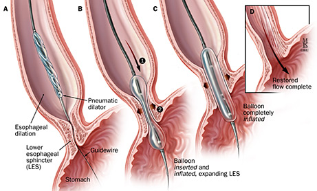 The many options available for treating patients with achalasia cannot stop or reverse the underlying loss of nerve cells in the esophagus or restore the normal peristaltic cntractions in the esophagus. Rather, the treatments aim to weaken the lower esophageal sphincter (LES) muscle to the point that it no longer acts as a barrier to the passage of food and liquids.