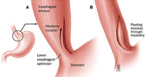 3. Botulinum toxin injection: Injection of botulinum toxin (botox) into the LES under endoscopic guidance temporarily paralyzes the nerves that make the LES contract, thereby helping to relieve the obstruction. The relief of sympotms with this expensive therapy is short term (3 – 12 months). Also, repeated injections create scarring in the muscles of the LES, and make the subsequent surgery more challenging. This treatment, once quite popular, has fallen out of vogue recently.